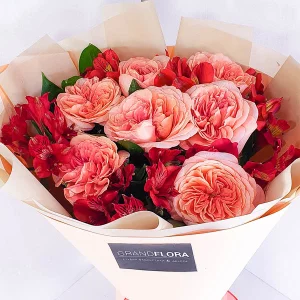 Заманчивая нежность – букет из кустовых хризантем и роз, альстромерий и эустом