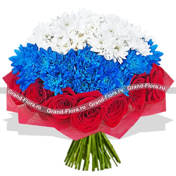 Стандартный: роза красная - 9 шт., хризантема синяя - 3 шт., хризантема белая - 4 шт., фетр красно-белый.
