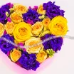 Люкс: роза желтая - 4 шт., роза кустовая желтая - 6 шт., эустома синяя - 11 шт., статица фиолетовая, статица желтая., оазис., фетр. Примерный размер 35Х35 см.