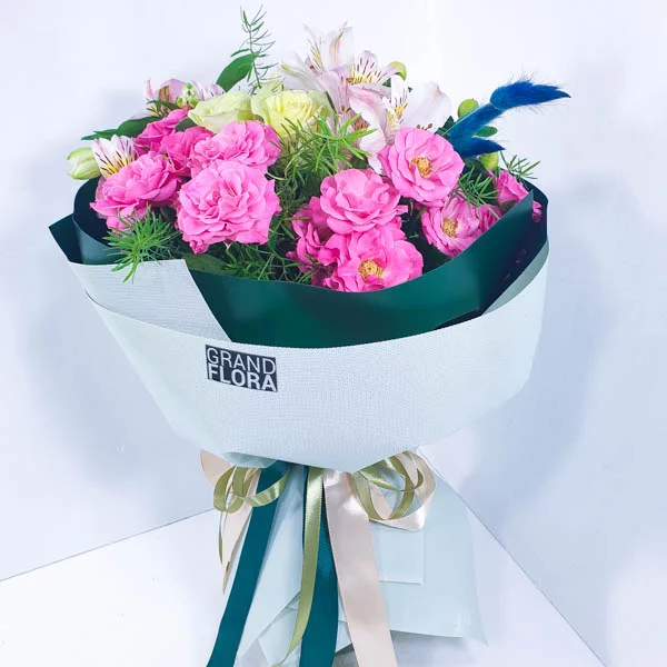 "Элегантная нежность" - это букет из белых роз и розовых альстромерий, который представлен в фирменной упаковке. Белые розы символизируют чистоту, невинность и идеальность, а розовые альстромерии - это символ любви и дружбы, их нежный оттенок делает их идеальным дополнением к белым розам. Кустовые розы создают естественный и живой акцент, добавляя еще больше элегантности и нежности к композиции.